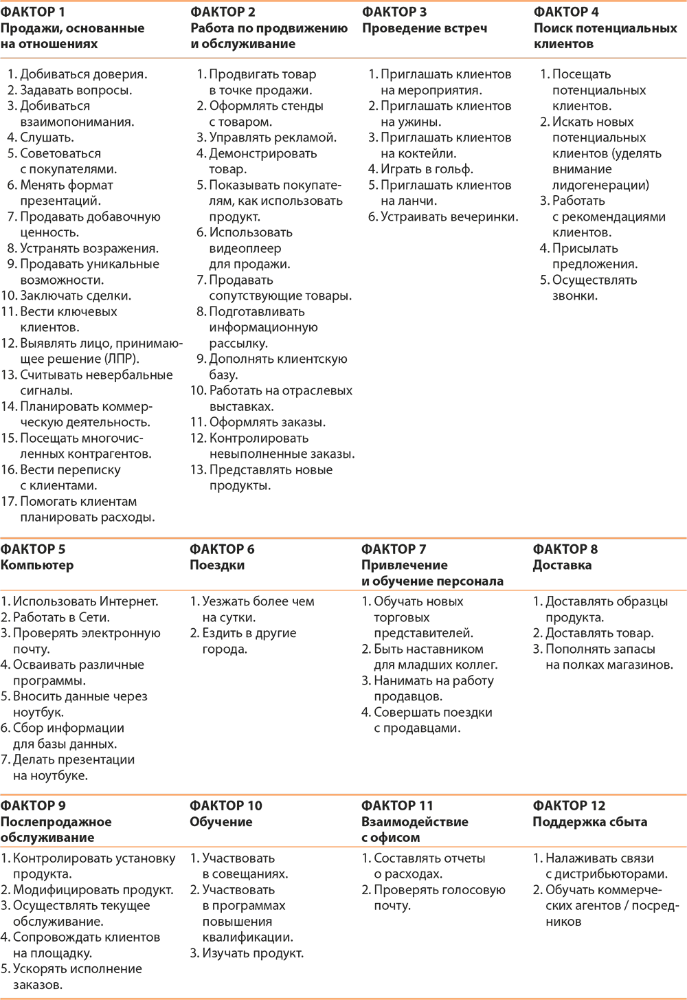 Таблица 2.3. Факторы, влияющие а работу продавца, и некоторые связанные с ними виды деятельности (что необходимо делать)