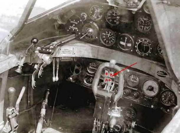 Вид на приборную доску и ручку управления самолетом. Стрелкой указаны гашетки управления стрельбой