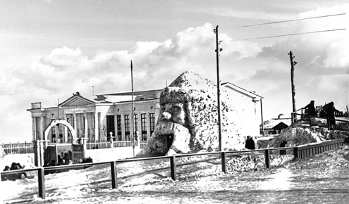 Рис. 1.35. Огромная голова витязя, из сказки А. С. Пушкина, изготовленная из льда на Новый Год около магаданского стадиона. Фотография примерно 1956 года, г. Магадан.