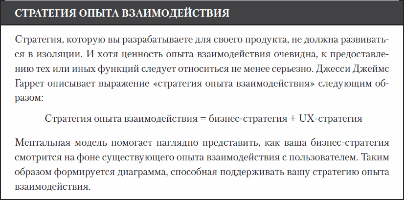 Мне очень хотелось понять, что же такое UX-стратегия, но, если не считать того факта, что стратегия «опыта взаимодействия» и стратегия «опыта взаимодействия с пользователем» различаются одним лишним словом, в книге эта абстрактная формула подробнее не рассматривалась. На протяжении всей моей карьеры, от работы для крупных интерактивных агентств до коммерческих предприятий, я слышала много других теоретических рассуждений о цели UX-стратегии. Как раз эту тему мне хотелось бы обойти стороной в книге: исключительно семантические диспуты о том, что же следует понимать под термином «стратегия» и имеет ли теоретическая основа какие-либо практические применения.