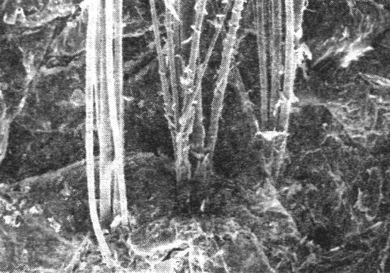 1 — сальная железа, 2 — апокриновая трубчатая железа, 3 — мышца, поднимающая волос, 4 — вторичные пуховые волосы, 5 — вторичные волосяные фолликулы