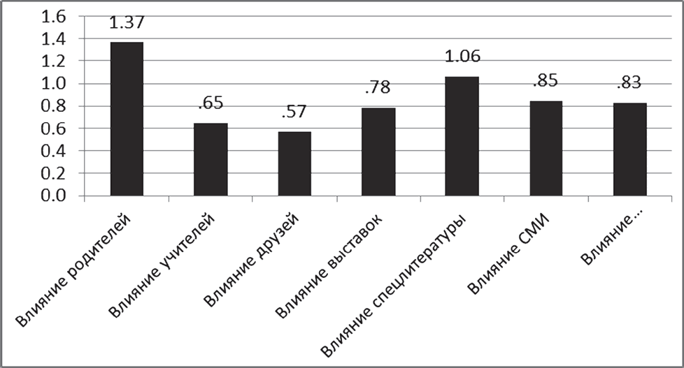 Анализ внешних факторов влияния (рис. 1) показал, что в высокой степени подростки опираются на мнение родителей, оказывает влияние и специальная литература. Кроме того, на выбор респондентов в значительной степени влияют СМИ. При этом в наименьшей степени ими учитывается мнение друзей и учителей. Все это может свидетельствовать о том, что старшеклассники в большей мере сверяют свой выбор с мнением семьи, а также стараются составить самостоятельное представление о мире профессий, используя доступные источники информации. Школа, где старшеклассники проводят значительную часть своего времени, и друзья, с которыми подростки общаются в свободное от учебы время, влияют на процесс профессионального самоопределения в наименьшей степени.