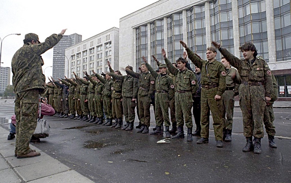 Мы вышли из кабинета в приемную. Из окон приемной была видна и территория, примыкавшая к зданию Дома Советов, и находившееся рядом здание американского посольства. У офицера, находившегося в приемной, были свои возможности более детально мониторить происходящее. А происходило следующее. По территории, примыкающей к Дому Советов, аккурат мимо наших окон маршировала колонна «необычных» баркашовцев. Статных, хорошо одетых, вымуштрованных, невесть откуда появившихся накануне (обычные баркашовцы — невзрачные, плохо одетые и невымуштрованные с самого начала находились в Доме Советов). Необычные баркашовцы больше всего напоминали подразделение военнослужащих, специально отобранных для исполнения воинских ритуалов (почетных караулов, торжественных похорон и так далее). Маршировали необычные баркашовцы очень и очень впечатляюще. Впереди шел человек с переносной рацией.