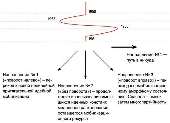 Направление № 3 («поворот вправо») — переход к немобилизационному аморфному состоянию. Сначала — рынок, затем — многопартийность.