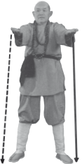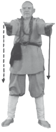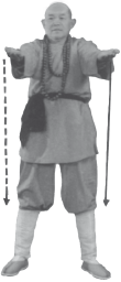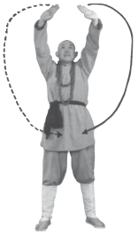 На вдохе ноги выпрямить в коленях. Одновременно центры ладоней развернуть вверх. Руки в локтях чуть согнуты. Ладони медленно поднять вверх с ощущением тяжести на ладонях и остановить на уровне груди. Центры ладоней развернуты вверх. Пальцы направлены вперед. Взгляд – вперед.