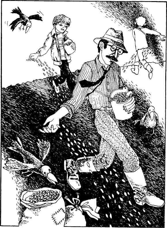 Прометеев еще раз показал ребятам, как надо бросать семена. После этого дело пошло лучше. Но затем Славе стало казаться, что горсть семян становится все тяжелей и тяжелей. Еще только половину своего участка засеял, а руку так отмотал, словно не семена бросал, а булыжники.