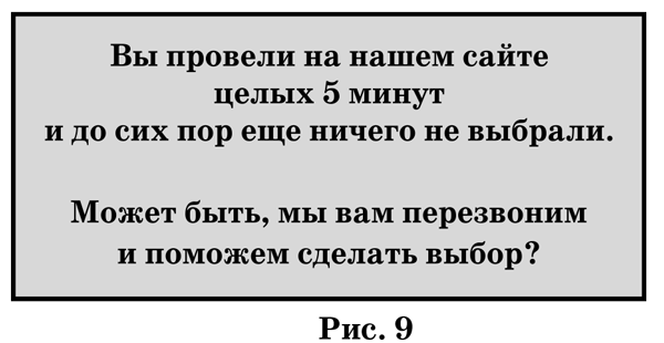 Сервис работает следующим образом: когда посетитель заходит на ваш сайт, проводит там какое-то небольшое количество времени, к примеру, 5 минут, и ничего не делает, то перед ним на странице появляется окно такого содержания (рис. 9).