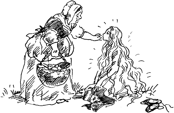 — Красивое ты дитя! — ахнула старуха. — Уж не пожалей, вырви один твой золотой волосок. Моя внучка в день святого Мартина выходит замуж. А мы так бедны, чуть богаче тебя. Она сплетёт себе обручальное кольцо из твоего золотого волоса.