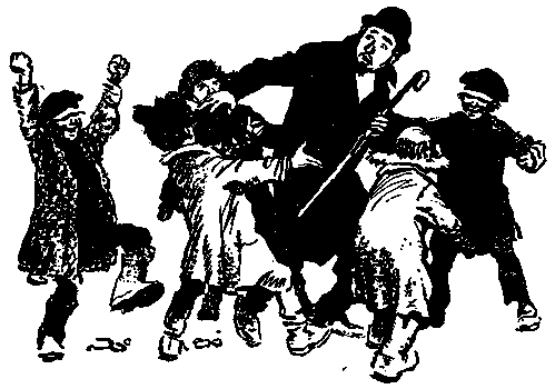 Шпик поскользнулся и упал, увлекая за собой ребят, котелок слетел у него с головы.
