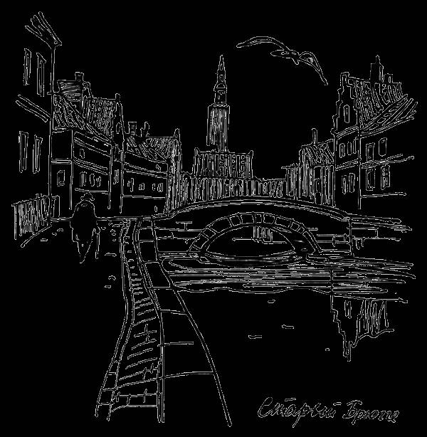 Вода течет медленно, ее поглощает черная тень моста, «изогнувшего свою печаль», как сказал поэт Морис Карэм. Отражаясь в канале, ломается зубчатая стена домов, даты там не прочесть, город там теряет возраст. Не сотворен ли он прихотью подводного владыки!
