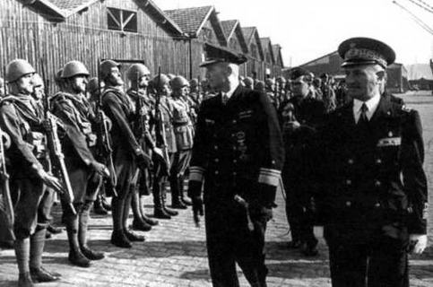 Контр-адмирал Парона и вице-адмирал Дёниц проводят смотр итальянским морским пехотинцам из охраны базы в Бордо