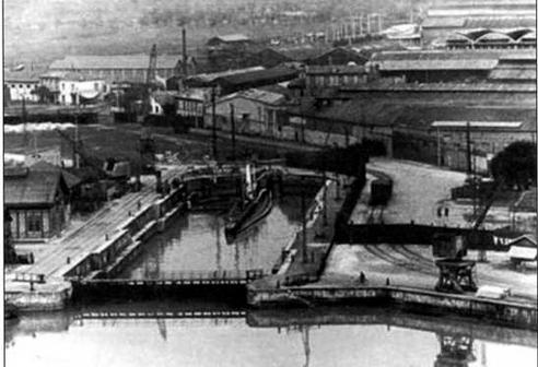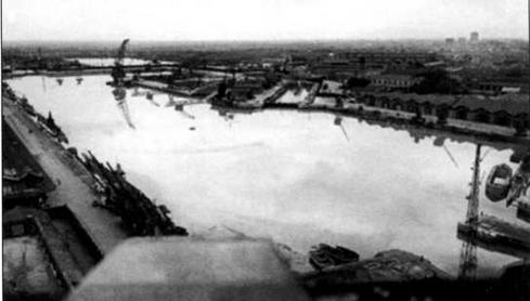 Внутренний бассейн базы в Бордо; в центре виден большой сухой док №1 с находящейся в нем итальянской подводной лодкой