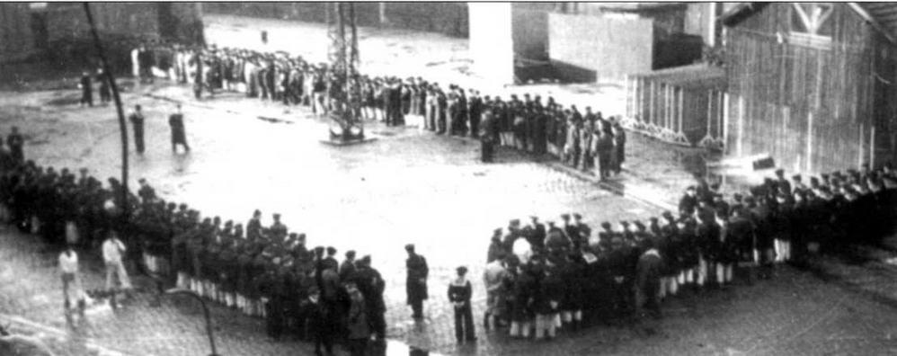 Построение экипажей подводных лодок на импровизированном плацу базы BETASOM