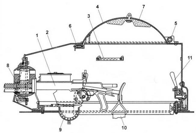 1 — пулемет ДТ; 2 — корпус башни; 3 — смотровая щель с заслонкой; 4 — откидной колпак; 5 — петля откидного колпака; 6 — стопор защелки откидного колпака; 7 — подушка; 8 — шаровая установка пулемета; 9 — гильзоулавливатель; 10 — ремень для стрелка; 11 — стопор походного крепления башни