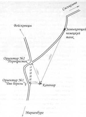За 1,5–2 мин, пока головной танк преодолевал расстояние до перекрестка, Колобанов убедился, что в колонне нет тяжелых танков, окончательно составил план боя и решил пропустить всю колонну до развилки (Ориентир № 1). В этом случае все танки успевали пройти поворот в начале насыпной дороги и оказаться в пределах досягаемости его пушки.