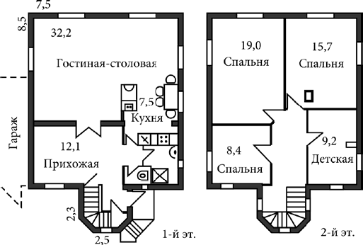 Планировка дома на рис. 2.2 тоже приспособлена для отопления зимой только первого этажа. Но здесь воздушные объемы нижнего и верхнего этажей разделены еще более четко. Это достигнуто вынесением лестницы в эркер. Вход на нее зимой закрывается дверью. Расположенная на первом этаже гостиная используется зимой как жилая комната. Печь обогревает ее и кухню. Прихожая превращается в традиционные сени – прохладное помещение между теплой жилой комнатой и входным тамбуром. Тепловой режим при такой планировке соответствует условиям, характерным для русской избы, и проверен веками. Если отопление газовое, то можно отапливать и прихожую.