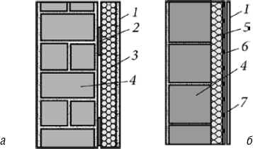 а – пенополистиролом; б – минераловатными плитами; 1 – гипсокартонная плита; 2 – клеевой раствор; 3 – пенополистирол; 4 – кладка; 5 – минераловатная плита; 6 – паронепроницаемая пленка; 7 – воздушный зазор