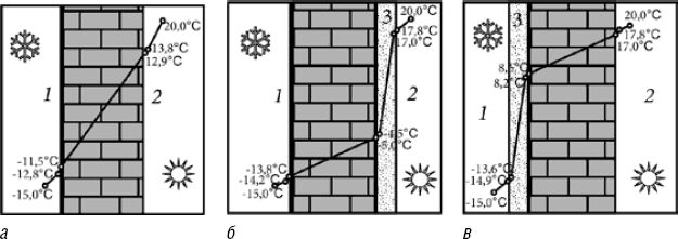 а – неутепленная стена; б – утепление изнутри; в – утепление снаружи; 1 – наружная сторона; 2 – сторона помещения; 3 – утеплитель
