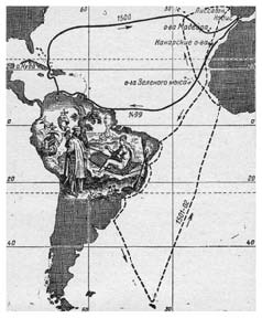 В понедельник, 3 октября, в полночь, мы плыли на всех парусах на юг и вступили в открытый Океан, пройдя между Зеленым Мысом и примыкающими к нему островами, расположенными на 14°30' широты. Таким образом мы шли много дней вдоль берегов Гвинеи или Эфиопии, где находится гора под названием Сьерра Леоне, расположенная на 8° широты, испытывая и противные ветры, и штили, и дожди без ветра, пока не достигли экватора, причем в течение шестидесяти дней беспрерывно лил дождь. Вопреки мнению древних [97] , до того, как мы достигли этой линии на 14° широты, мы выдержали много яростных шквалов и течение шло против кормы. Так как не было возможности двигаться вперед, то, во избежание кораблекрушения, паруса убирались, и таким-то образом нас носило то туда, то сюда все время, пока продолжалась буря, – так яростна была она. При дожде ветер стихал. С появлением солнца наступало затишье. Какие-то большие рыбы, называемые акулами, подплывали к кораблям. У них страшные зубы, и как только им попадается человек, они пожирают его. Мы выловили много рыб при помощи железных крюков, но они непригодны для еды; размерами поменьше лучше, но точно так же не годятся для этой цели. Во время этих бурь нам не раз являлось святое тело, т. е. св. Эльм, в пламени [98] , а в одну очень темную ночь он показался на грот-мачте, пылая точно ярко горящий факел, где и оставался в продолжение двух с лишним часов, принося нам отраду, так как все мы проливали слезы. Когда этот благословенный свет погас, столь яркой была его последняя вспышка, что она поразила наше зрение, и все мы больше чем одну восьмую часа не могли видеть ничего и молили, чтобы сжалились над нами. Но как раз тогда, когда мы считали себя на краю гибели, море внезапно успокоилось. Я видел много разнообразных родов птиц, в том числе таких, которые вовсе не имеют гузки; были и другие, у которых самка, собираясь класть яйца, делает это на спине самца и там же высиживает их. У этой птицы нет ног, и она постоянно живет на море. Видел я и такую птицу, которая питается пометом других птиц и, кроме этой, никакой иной пищи не принимает. Я часто наблюдал, как эта птица, называемая «кагасела», летала вслед за другой до тех пор, пока последняя не выпускала помета, который первая немедленно же подхватывала, после чего оставляла преследуемую в покое. Я видел летающих рыб и много других рыб, собравшихся вместе, так что они напоминали собою целый остров.