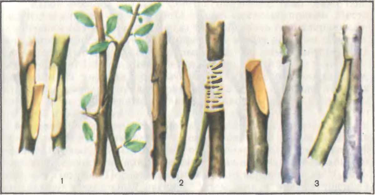 Рис. 13. Прививка сближением: 1,2 — тонких подвоев и привоев, 3 — толстого подвоя и толстого привоя (по Н. И Кичумову)
