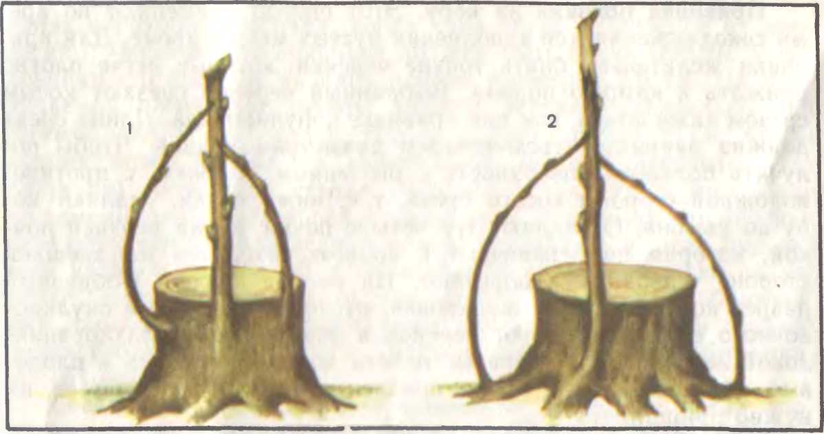 Р и с. 22. Погибшая надземная часть дерева: 1 — образование кроны из волчков выше прививки; 2 — образование кроны с последующей прививкой культурного сорта из волчков корневой поросли