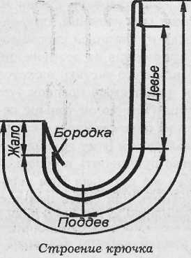 Для начала ознакомимся с частями, на которые принято подразделять строение крючка. Это — цевье, поддев, жало и бородка.