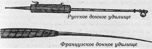Донная удочка, употребляемая тоже с давних времен, обычно состояла из короткого, до 1,5 метра, удилища из можжевелового прута. К нему наглухо крепился запас лески, длиной в несколько десятков метров. На конец лески вязали тяжелое грузило, могущее удержать леску в натяжении даже на течении. На небольшом расстоянии от грузила, часто не далее полуметра, привязывался поводок с крючком. В качестве сторожка использовались колокольчики и разной конструкции сигнализаторы поклевки.