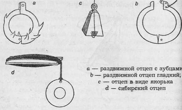 Отцепы, отбойники и т. п. были известны давно. Если говорить об орудиях, использовавшихся для освобождения снасти из травяного или иного подводного плена, то уже в прошлом веке это были, в основном, различные металлические кольца, которые пускались по лесе зацепившейся снасти и высвобождали ее путем отбоя. Устройство этого нехитрого орудия видно на рисунке, изображающем бывший в ходу в прошлом веке сибирский отцеп. Другие варианты этого приспособления ничего оригинального или отличного от этой конструкции не имели.