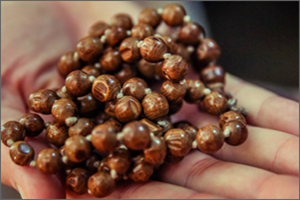 А орудием джапы являются четки — мала. В трактатах можно найти специальную молитву, которую надо читать четкам перед тем, как их взять в руки. Да, прежде чем молиться, надо помолиться тому, на чем мы будем молиться. Так что, даже начать молиться без молитвы нельзя. Вот эта мантра: