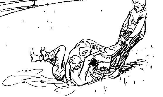 Некоторое время они топтались на одном месте, затем Димка упал, увлекая Петьку. Они возились на земле. Петька навалился на Димку, пытаясь перевернуть его на спину. Вот одна лопатка коснулась земли… Димка рванулся, и Петька, воспользовавшись этим, упал на него сверху, пригвоздив к земле.