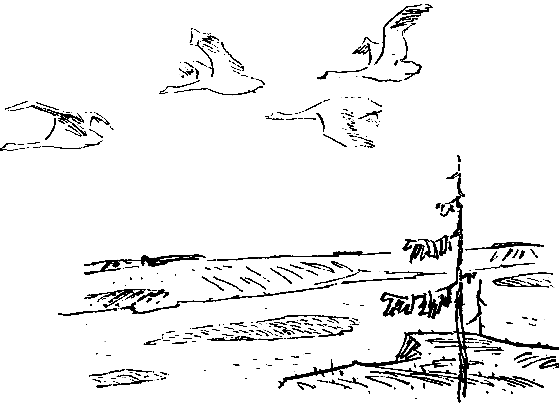 Примерно через час полета Гога толкнул Федю в бок и кивком показал вниз, за борт самолета. Федя, осторожно вытянув шею, взглянул на землю. Под ними, чуть впереди, тяжело махая крыльями, стоял на месте косяк гусей. Федя не сразу понял, почему они еле двигаются. Грузные, неуклюжие птицы летели чуть медленнее самолета.