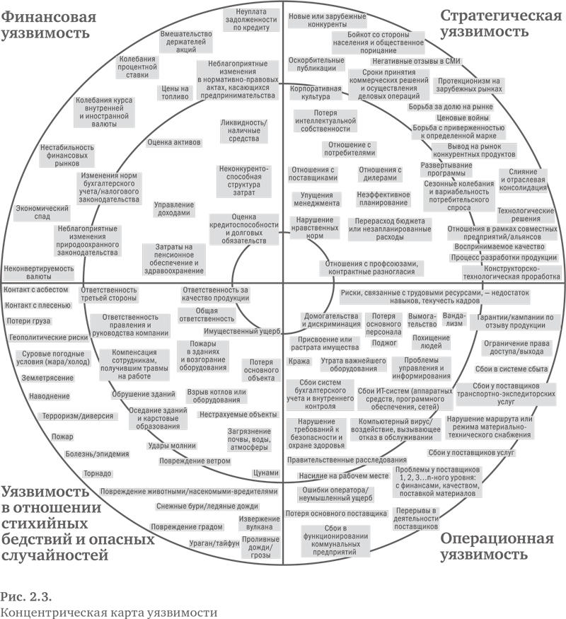 Для классификации возможных сбоев в GM разработали карту уязвимости, состоящую из четырех квадрантов, как показано на рис. 2.3 {50} . Четыре категории включают финансовую уязвимость, стратегическую уязвимость, уязвимость в отношении стихийных бедствий и опасных случайностей и операционную уязвимость. Все виды уязвимости на схеме размещены в концентрических кругах, факторы, расположенные ближе к центру круга, как правило, связаны с самой организацией, тогда как те, что находятся на периферии, обычно являются результатом внешних воздействий.