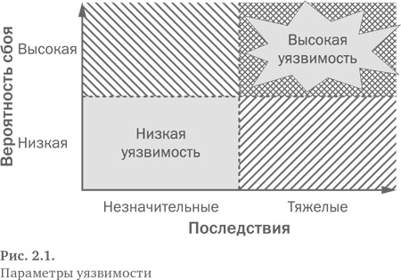 Уязвимость характеризуется множеством изменчивых факторов, при этом инструменты для измерения этих факторов слишком грубы, чтобы свести их в единый показатель «ожидаемой уязвимости». Такой показатель представляет собой комбинацию вероятности и последствий. Таким образом, каждый из четырех квадрантов на рис. 2.1 имеет конкретное значение. Уязвимость максимальна, когда вероятность высока, а последствия серьезны. И наоборот, если последствия событий незначительны и вероятность их невысока, уровень уязвимости низок.