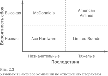 Различные компании обнаруживают разный уровень уязвимости по отношению к тем или иным видам сбоев. Рассмотрим, к примеру, такой вид разрушительных воздействий, как антиамериканские диверсии или теракты, наносящие значительный ущерб активам компании. Вероятность такого нападения отчасти определяется тем, до какой степени данная компания ассоциируется с США. Последствия нападения находятся в прямой зависимости от жизнестойкости компании и определяются ее способностью оградить от агрессивного влияния своих потребителей.