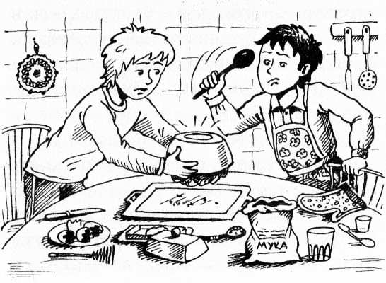 Они вдвоём перепробовали всё: переворачивали форму, стучали по донышку, трясли и поливали водой. Наконец осталось последнее средство: отскрести бисквит ножом и ложкой выложить на тарелку. Получилась гора крошек и бисквитного лома.