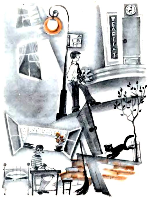 Сел он наконец в автобус, а кошка — крышами, крышами, с дома на дом — напрямик. У телеграфа слезла с пятого этажа по водосточной трубе. Математик с машины — кошка под ноги.