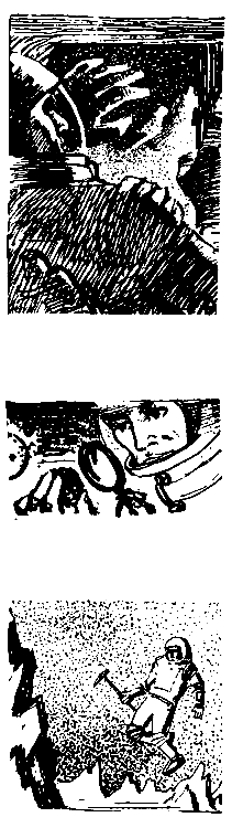В кармане скафандра был геологический молоток. Я вытащил его и, перепрыгивая через небольшие трещины, бросился к подножию ближайшего уступа. Уступ был сложен стекловидный зеленой массой, напоминающей земную лаву. Размахнувшись, я ударил молотком по зеленой скале. Молоток скользнул и отскочил. Я ударил сильнее. Удалось отколоть небольшой образец, но сам я, не рассчитав силы удара, отлетел на несколько метров от скалы и едва устоял на ногах. Куда девался отбитый образец?