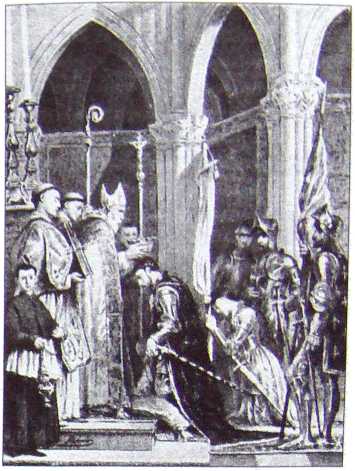 В письме трех анжуйских дворян королеве Марии, которая из-за очередной беременности осталась в Париже, говорилось: "В час, когда король был миропомазан и также когда ему на голову возложили корону, все закричали: "Ноэль!"[6] И трубы зазвучали так громко, что казалось, своды церкви рухнут. И во время этого таинства Дева постоянно находилась рядом с королем и держала в руке свое знамя. И было так отрадно видеть короля, державшегося с большим благородством и достоинством, а также Деву. И Богу лишь известно, были ли вы здесь желанны". На кар тинах, изображающих эту церемонию, Жанну изображают в латах, но на самом деле она была в платье из золотой парчи. Возможно, ее уговорили не нарушать приличий, но архиепископ Реньо был возмущен этим: "Она возгордилась и облачилась в роскошные одежды". Думается, правда, что если бы она явилась в собор в мужском костюме, святой отец был бы недоволен еще больше.