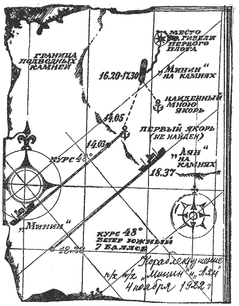 Нужно было узнать направление ветра в момент аварии. И тогда Белов попросил найти ему якоря. В случае обнаружения хотя бы одного картина становилась ясной: линия, проведенная от якоря к пароходу, сразу же давала направление ветра.