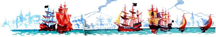 Ветра не было. Чёрные флаги на судах, стоявших в гавани, поникли. Солнце уже взошло, но — странное дело — над горами в глубине острова удерживалось красное зарево.
