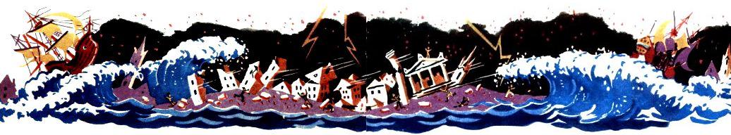 Со стороны моря к порту приближалась волна. Вода в гавани вспучилась и подняла корабли. Лопнули цепи. Суда, сорванные с якорей, одно за другим устремились на берег. Волны хлынули в подвалы с драгоценностями. Они вырывали ставни, опрокидывали на площадях статуи, несли вдоль мостовой ковры и украшения, вывезенные разбойниками из Мексики…