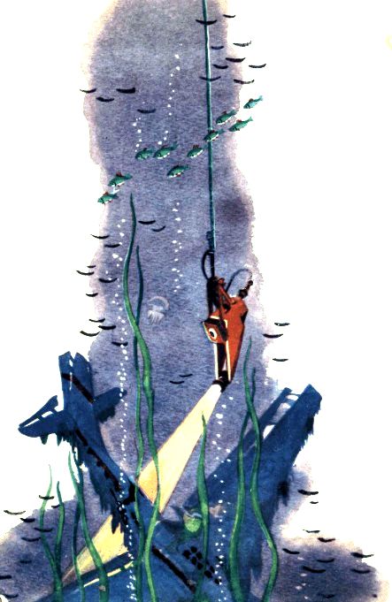 Наконец одному судну повезло. Его магнитный искатель показал, что на дне лежит какой-то предмет с большим числом стальных деталей. Это мог быть и самолёт, — ведь его моторы сделаны из стальных сплавов. Но как спуститься к нему? Глубина в этом месте была такой, что водолазы работать не могли.