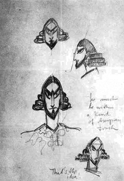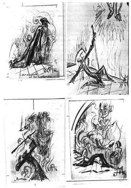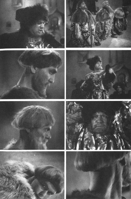 Тут самое время вспомнить, что в «Венчании на царство» шапка Мономаха ложится на кудри Ивана, завитые, как на древних барельефных изображениях восточных деспотов. Эту пластическую ассоциацию режиссер не раз подчеркивал в набросках грима молодого Ивана.