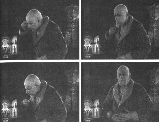 Сыгранный Мейерхольдом сановник так и не доносит руку до левого плеча, а опускает ее, обхватывая обеими ладонями живот и самодовольно улыбаясь. Привычно крестясь на ночь, он явно занят не благочестивыми, а сугубо мирскими мыслями (о приеме у губернатора? о наказании бунтовщиков? о своей карьере?)…