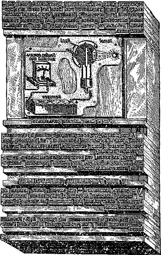 На рисунке видны также пластинки (пробельный материал), которые находятся между некоторыми строками и вокруг клише. Эти пластинки ниже ростом, чем шрифт и клише, и не дадут поэтому отпечатка на бумаге.