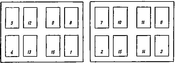 Чтобы понять, в каком порядке ставят свёрстанные полосы, возьмите лист бумаги, сложите его три раза пополам так, чтобы каждый новый сгиб был перпендикулярен к предыдущему. В образовавшейся тетрадке будет 16 страниц. Разверните теперь лист и напишите на каждой его стороне по восьми номеров страниц, как указано на рис. 14. Если вы снова сложите лист в тетрадку, или, как говорят полиграфисты, сфальцуете его (нужно, чтобы тетрадка начиналась с первой страницы), а потом разрежете сгибы сверху и сбоку, то страницы окажутся в нужном порядке — от 1-й до 16-й (на корректурном станке полосы набора были расположены, конечно, в зеркальном виде).