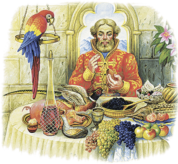 Дивится честной купец такому богатству несказанному, а вдвое того, что хозяина нет; не только хозяина, и прислуги нет; а музыка играет не смолкаючи; и подумал он в те поры про себя: «Всё хорошо, да есть нечего» – и вырос перед ним стол, убранный-разубранный: в посуде золотой да серебряной яства стоят сахарные, и вина заморские, и питья медвяные. Сел он за стол без сумления; напился, наелся досыта, потому что не ел сутки целые; кушанье такое, что и сказать нельзя, того и гляди, что язык проглотишь, а он, по лесам и пескам ходючи, крепко проголодался; встал он из-за стола, а поклониться некому и сказать спасибо за хлеб за соль некому. Не успел он встать да оглянуться, а стола с кушаньем как не бывало, а музыка играет не умолкаючи.