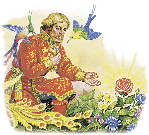 Ходит честной купец, дивуется; на все такие диковинки глаза у него разбежалися, и не знает он, на что смотреть и кого слушать. Ходил он так много ли, мало ли времени – неведомо: скоро сказка сказывается, не скоро дело делается. И вдруг видит он, на пригорочке зелёном цветёт цветок цвету алого, красоты невиданной и неслыханной, что ни в сказке сказать, ни пером написать. У честного купца дух занимается; подходит он ко тому цветку; запах от цветка по всему саду ровно струя бежит; затряслись и руки и ноги у купца, и возговорил он голосом радостным:
