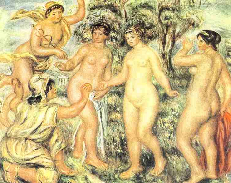 Даже вручение ордена Почетного легиона в 1900 году не могло отвлечь его от страданий, вызванных болезнью; к тому же, принимая награду, он испытывал некоторое замешательство от участия в официозе, который раньше отвергал. Впрочем, окончательное признание со стороны публики и критики пришло только в 1904 году, когда в рамках Осеннего Салона бьша организована большая ретроспективная выставка всех его произведений. Всеобщий восторг и воодушевление были так сильны, что заставили его забыть, насколько безрезультатным оказался летний курс лечения в Бурбон-ле-Бен. Вообще, единственное, что поддерживало его все эти годы, пока он худел и страдал все сильнее, была его жажда писать, породившая серию больших полотен с обнаженной натурой, — форма, которую он считал «неотъемлемой частью искусства», — и портрета, ознаменовавшие решительный поворот назад, к импрессионистской технике. Его быстрый и легкий мазок великолепно передавал нежность и мягкость кожи, чему способствовал выбор блестящих красок и массивных форм, навеянных творчеством Рубенса, Тициана и Фрагонара. Тем временем на аукционе, где продавалась коллекция Шарпантье, «Портрет госпожи Шарпантье с детьми» получил невообразимую оценку — 84 тысячи франков. Ренуар смог, наконец, купить большой дом, окруженный оливковой рощей, в Кане, на Лазурном берегу, откуда открывался вид на море до самого Антибского мыса и Эстереля; он надеялся, что это пойдет на пользу его все ухудшавшемуся здоровью. Будучи прикован к креслу на колесах, он заказал себе передвижной мольберт, позволявший ему подобраться к холсту; пальцы уже не действовали, и только благодаря заботам жены и верной Габриэль, бинтовавших ему руки и привязывавших кисть между большим и указательным пальцами, он еще мог писать. Лечение ни к чему не привело; и хотя ему удавалось ценой больших усилий сделать несколько шагов, он предпочитал беречь силы, чтобы продолжать писать. Несмотря на физическую немощь, его живой интеллект и жажда жизни оставались прежними, он даже занялся ваянием и создал около пятнадцати скульптур и несколько медальонов Делакруа, Энгра, Коро и Сезанна.