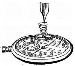 Когда спиральная пружина развертывается, баланс опускается и цапфа ударяется о стекло часов. Принимая для счета отрезок времени в какое-то количество секунд (удобнее принимать от 10 сек. и выше с интервалом 5 или 10 сек.), производят подсчет количества ударов цапфы проверяемого баланса о стекло.